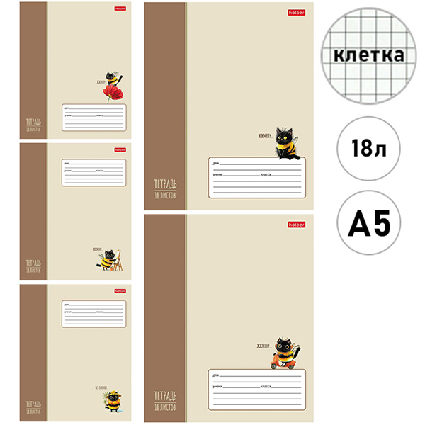Тетрадь А5 18л клетка Hatber Жж-Мяу, офсет, на скобе, обложка - мелованный картон, тиснение, скругленные углы, 5 дизайнов в спайке