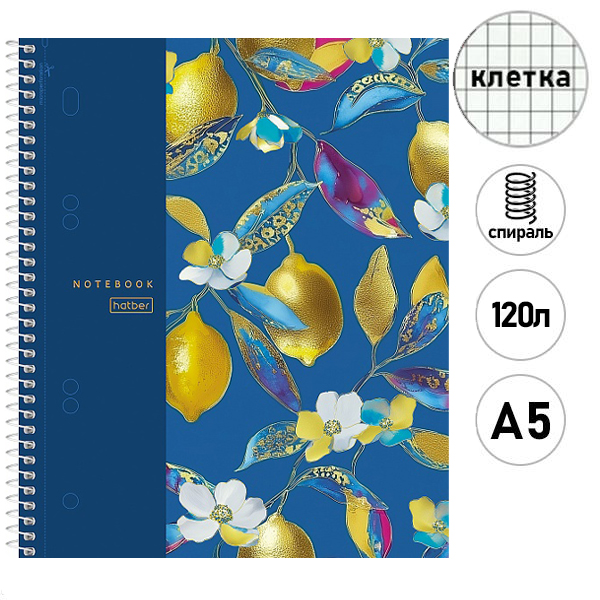 Тетрадь спираль А5 120л клетка Hatber Солнечные лимоны, офсет, обложка - мелованный картон, ламинация soft-touch, перфорация, 3 цветных разделителя, индивидуальная упаковка, 1 дизайн в коробке