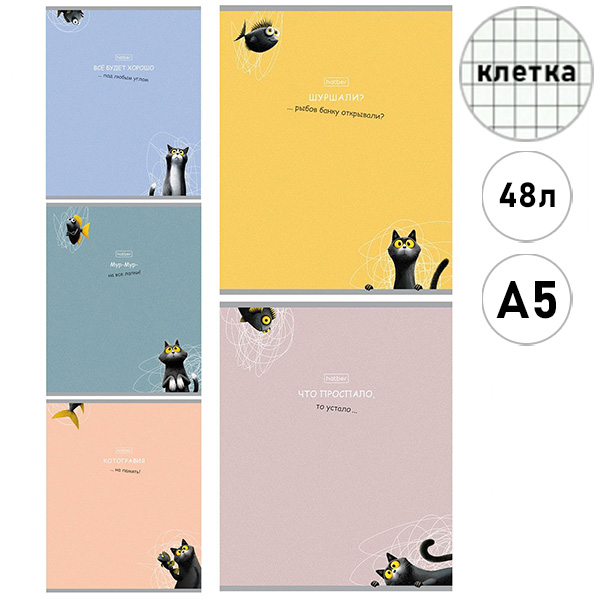 Тетрадь А5 48л линия Hatber Пушистый философ, офсет, на скобе, обложка - мелованный картон, тиснение, скругленные углы, 5 дизайнов в спайке