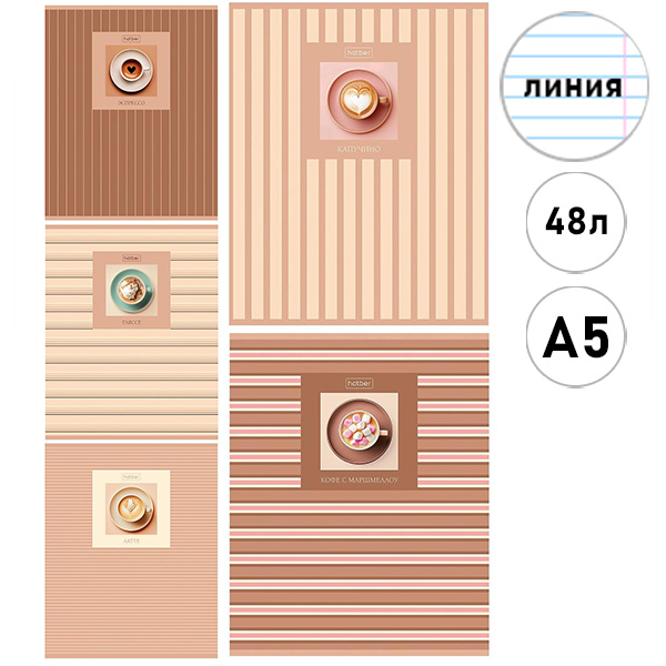 Тетрадь А5 48л линия Hatber Coffee line, офсет, на скобе, обложка - мелованный картон, тиснение, скругленные углы, 5 дизайнов в спайке