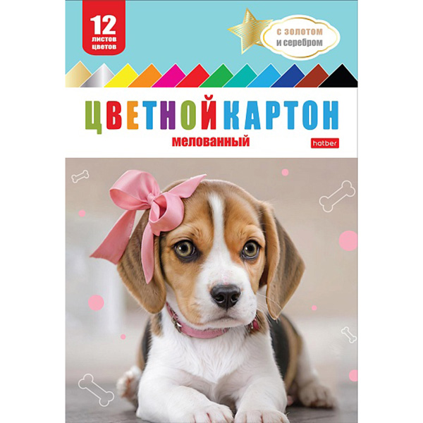 Картон цветной А4 мелованный, золото+серебро, 12л 12цв Hatber Милые ушки, 190г/м2, в папке