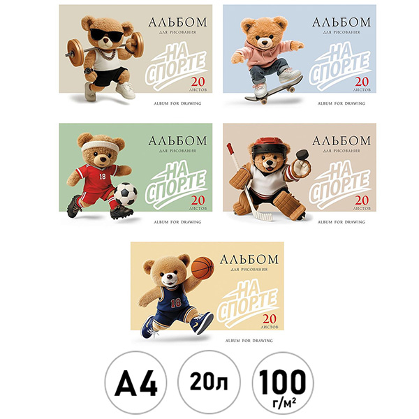 Альбом А4 20л Hatber На спорте (ассорти), на скобе, обложка - мелованный картон, тиснение, блок-офсет- 100г/м2, 5 дизайнов в спайке