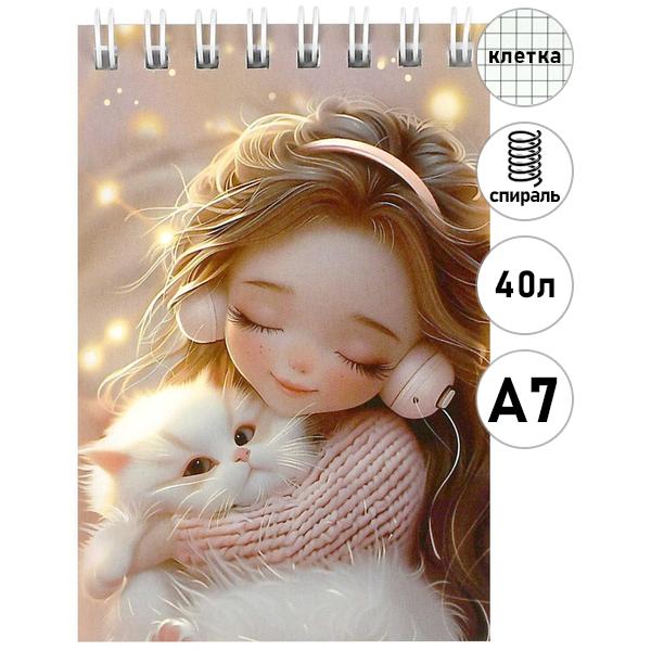 Блокнот МАЛЫЙ ФОРМАТ А7 спираль сверху 40л Феникс Девчонка в наушниках и котенок, клетка, обложка - мелованный картон, сплошной УФ-лак, белый офсет, 70*100мм