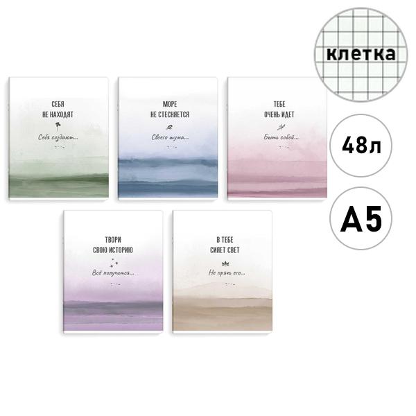 Тетрадь А5 48л клетка Феникс Акварель, офсет, на скобе, обложка - мелованный картон, ламинация soft-touch вельвет, 5 дизайнов в спайке