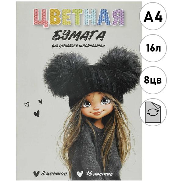 Бумага цветная А4 газетная, двухсторонняя, 16л 8цв Феникс Девчонка в шапке, на скобе