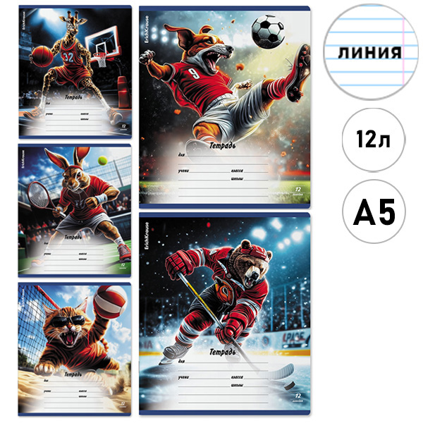 Тетрадь А5 12л линия Erich Krause Sport Animals, Mix-pack, офсет, на скобе, обложка - мелованный картон, скругленные углы, 5 дизайнов в спайке