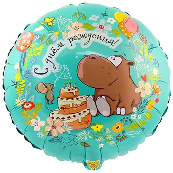 Шар фольгированный 18 /46см Круг С Днем рождения! Бегемот с тортом
