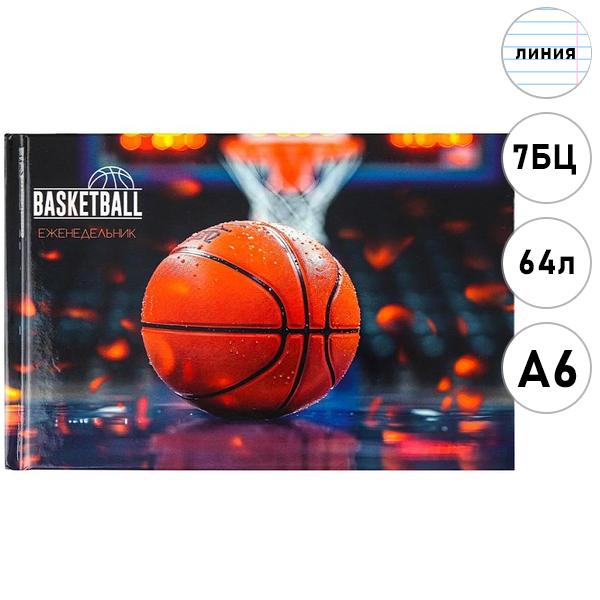Еженедельник недатированный МАЛЫЙ ФОРМАТ А6 108*151мм 7БЦ Проф-Пресс 64л Баскетбольный мяч, горизонтальный, линия, глянцевый ламинированный картон, белый офсет, печать в 1 краску, склейка, справочная информация