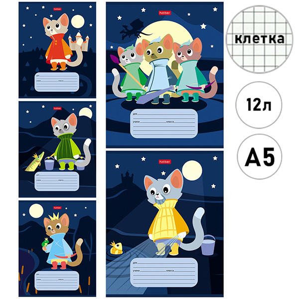 Тетрадь А5 12л клетка Hatber КотоСказки, офсет, на скобе, обложка - мелованный картон, скругленные углы, 5 дизайнов в спайке