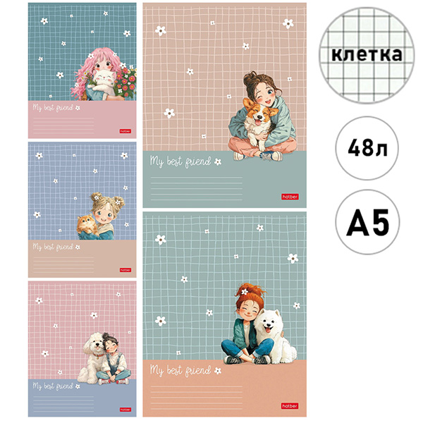 Тетрадь А5 48л клетка Hatber Пушистые объятия, офсет, на скобе, обложка- мелованный картон, скругленые углы, 5 дизайнов в спайке