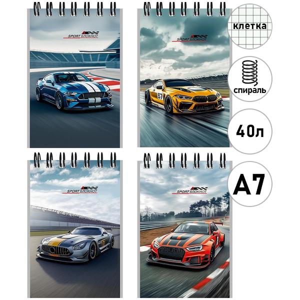 Блокнот МАЛЫЙ ФОРМАТ А7 спираль сверху 40л Проф-Пресс Красивые автомобили- 10, клетка, обложка - мелованный картон, 4 дизайна