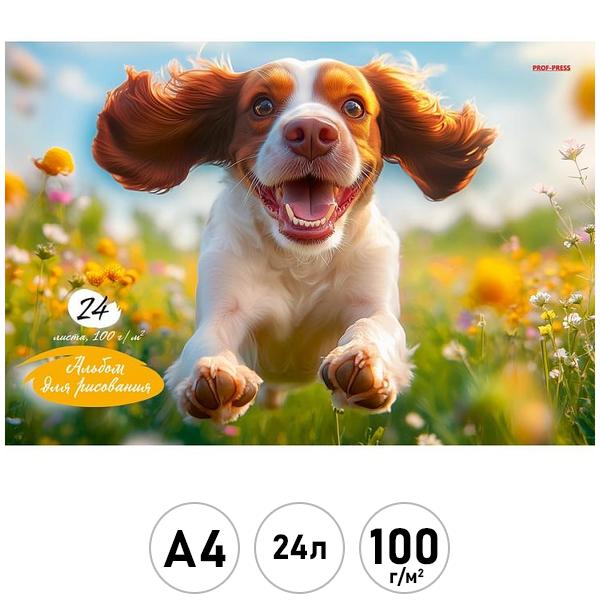 Альбом А4 24л Проф-Пресс Улыбка песика, на скобе, обложка- мелованный картон, блок- офсет 100г/м2, лен, 1 дизайн в спайке