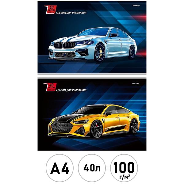 Альбом А4 40л Проф-Пресс Стремительные машины, скоба, обложка- мелованный картон, блок- офсет 100г/м2, лен, 2 дизайна в спайке