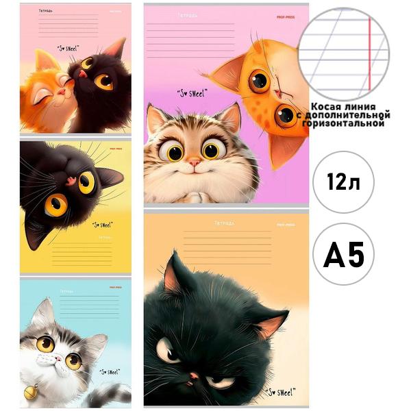 Тетрадь А5 12л косая линия с дополнительной горизонтальной Проф-Пресс Кошачьи мордочки- 4, офсет, на скобе, обложка - мелованная бумага, 5 дизайнов в спайке