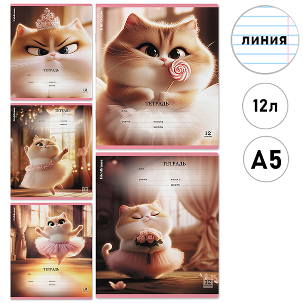 Тетрадь А5 12л линия EK Prima Cat, Mix-pack, офсет, на скобе, обложка - мелованный картон, выборочный УФ-лак c глиттером, 5 дизайнов в спайке