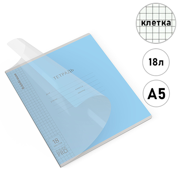 Тетрадь с пластиковой обложкой А5 18л клетка Erich Krause Классика CoverPrо fizzy Голубая, офсет, на скобе, скругленные углы,1 дизайн в коробке