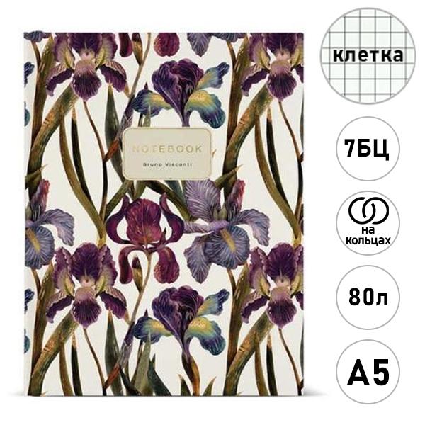 Тетрадь на кольцах 7БЦ А5 80л клетка Bruno Visconti Flora. Ирисы, офсет, обложка - глянцевый ламинированный картон, сменный блок, 1 дизайн в коробке