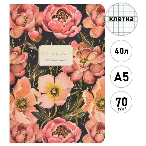 Тетрадь А5 40л Bruno Visconti Flora. Pink Blossom, клетка, сшивка, обложка- мелованный картон, матовая ламинация, soft-touch, тиснение фольгой, тонированный блок 70г/м2, вторая обложка с титульным листом, скругленные углы
