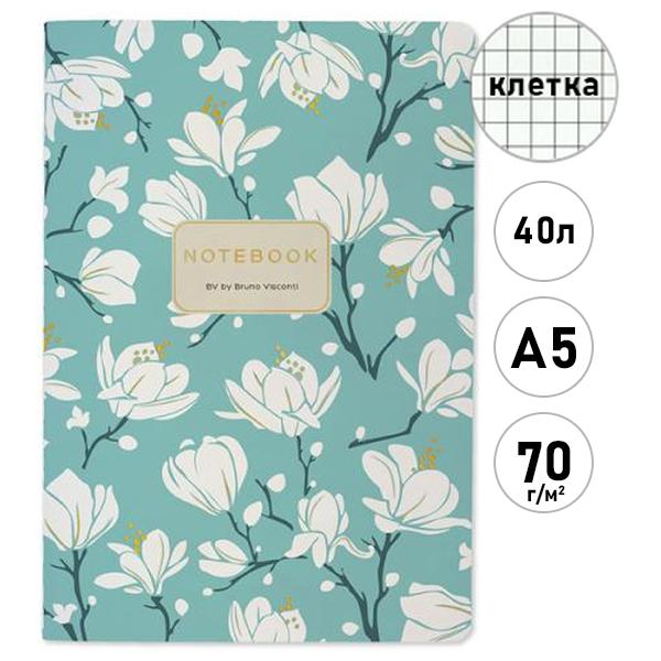 Тетрадь А5 40л Bruno Visconti Flora. Магнолия, клетка, сшивка, обложка- мелованный картон, матовая ламинация, soft-touch, тиснение фольгой, тонированный блок 70г/м2, вторая обложка с титульным листом, скругленные углы