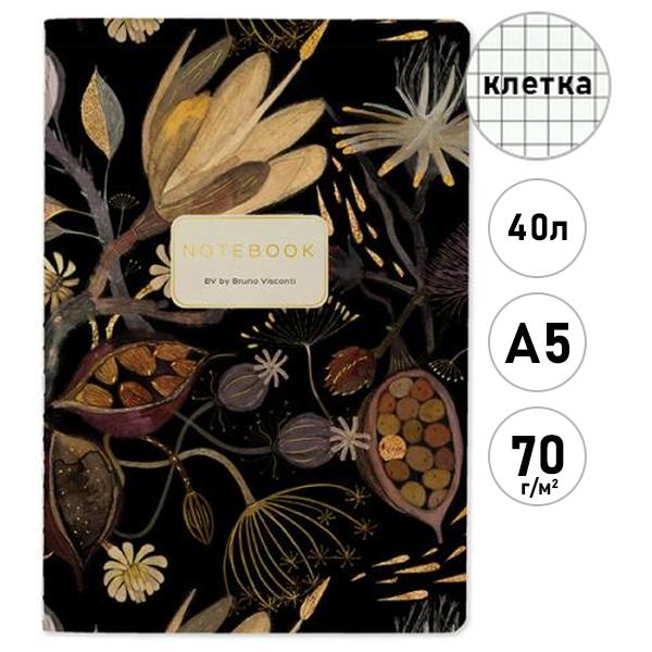 Тетрадь А5 40л Bruno Visconti Flora. Ночные цветы, клетка, сшивка, обложка- мелованный картон, матовая ламинация, soft-touch, тиснение фольгой, тонированный блок 70г/м2, вторая обложка с титульным листом, скругленные углы