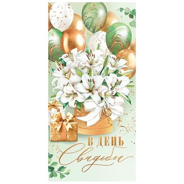 Конверт для денег Мир открыток 2-16 Свадьба- В День Свадьбы! Букет белых лилий, шары, 83*168мм, золотые блестки, рельеф, без текста