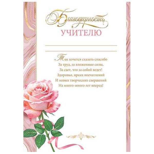 Благодарность учителю А4 9-01 Мир открыток Розовая роза, фольга, мелованный картон 190г/м2, текст