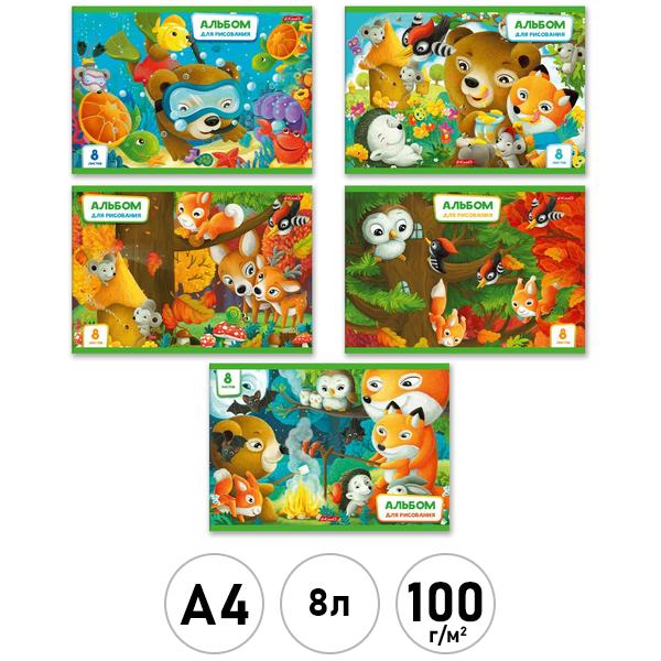 Альбом А4 8л Светоч Лесные жители (ассорти), на скобе, обложка - мелованный картон, блок-офсет- 100г/м2, 5 дизайнов в коробке