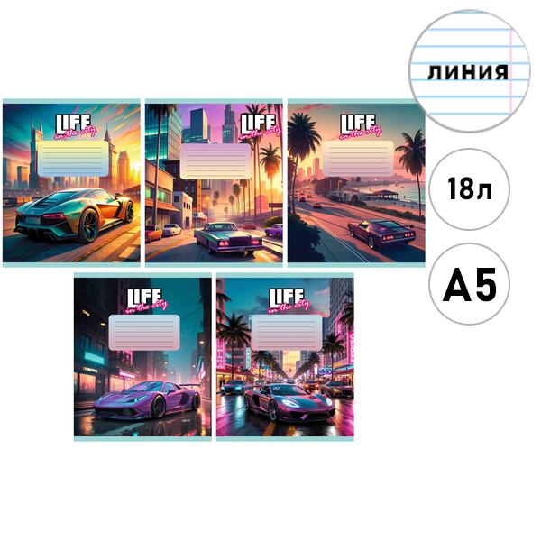 Тетрадь А5 18л линия Эксмо Жизнь в городе, офсет, на скобе, обложка - мелованный картон, 5 дизайнов в коробке