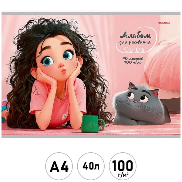 Альбом А4 40л Проф-Пресс Девушка и кот- 1, скоба, обложка- мелованная бумага, блок- офсет 100г/м2, 1 дизайн в спайке