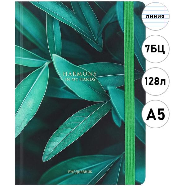 Ежедневник недатированный А5 147*210мм на резинке 7БЦ Проф-Пресс 128л Зеленые листья- 2, линия, мелованный картон, матовая ламинация, белый офсет, печать в 1 краску, скругленные углы, справочная информация
