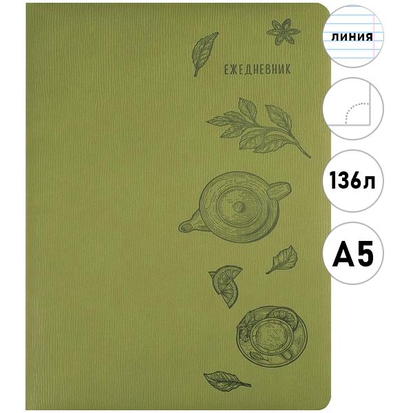 Ежедневник недатированный А5 искусственная кожа Проф-Пресс 136л Tea line- оливковый, линия, поролон, тонированный блок, тиснение, ляссе, перфорация углов, скругленне углы, справочная информация