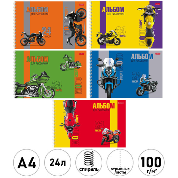 Альбом А4 24л спираль Hatber Турбомото (ассорти), обложка - мелованный картон, выборочный матовый лак, блок- офсет 100г/м2, отрывные листы, 5 дизайнов в спайке