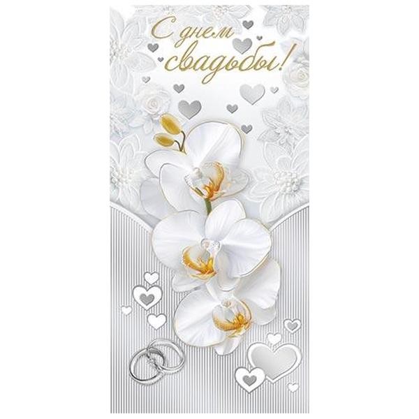 Конверт для денег Мир открыток 2-17 Свадьба- С Днем Свадьбы! Белые орхидеи, кольца, 85*165мм, фольга серебряная