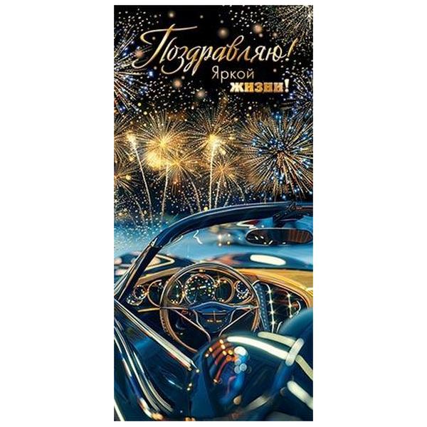 Конверт для денег Мир открыток 2-17 Мужской- Поздравляю! Кабриолет, салюты, 85*165мм, золотая фольга