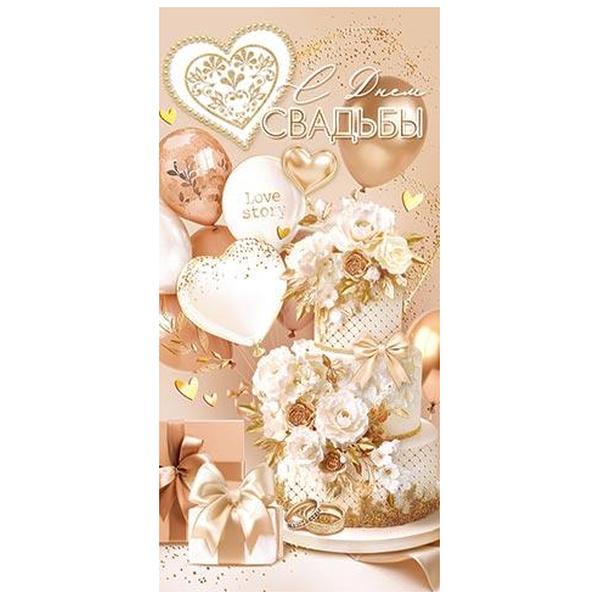 Конверт для денег Мир открыток 2-17 Свадьба- С Днем Свадьбы! Свадебный торт с цветами, шары, 85*165мм, золотая фольга