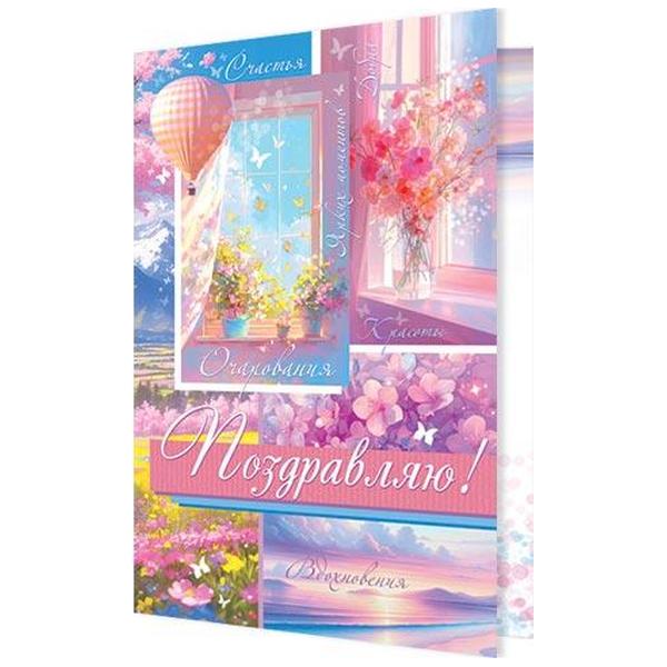 Открытка Мир открыток 2-46 Поздравляю! Закат, вид из окна, цветы, 123*187мм, рельеф, блестки, текст