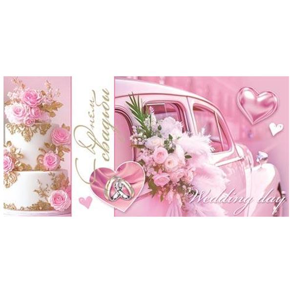 Конверт для денег Мир открыток 4-15 Свадьба- С Днем Свадьбы! Розовая машина, букет цветов, торт, 168*83мм, без отделки, без текста