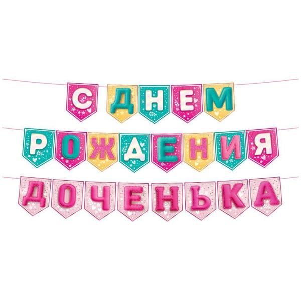 Гирлянда Открытая планета 331 С Днем рождения, доченька! Разноцветные флажки, сердца, длина 3,5м, 21 элемент, лента, без отделки