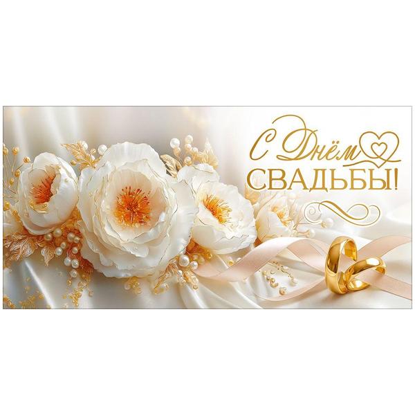 Конверт для денег Праздник 425 Свадьба- С Днем Свадьбы! Белые с золотом и жемчугом цветы, кольца, ленты, 168*84мм, радужные блестки в лаке, текст