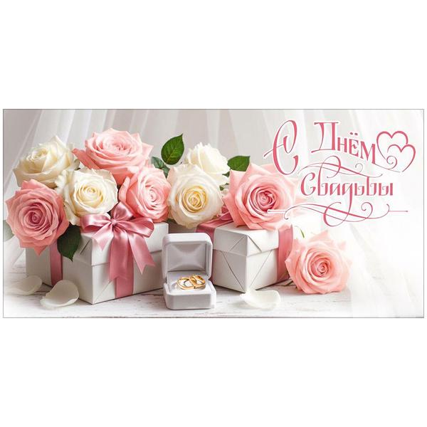 Конверт для денег Праздник 425 Свадьба- С Днем Свадьбы! Коробки с лентами, белые и розовые розы, кольца, 168*84мм, радужные блестки в лаке, текст